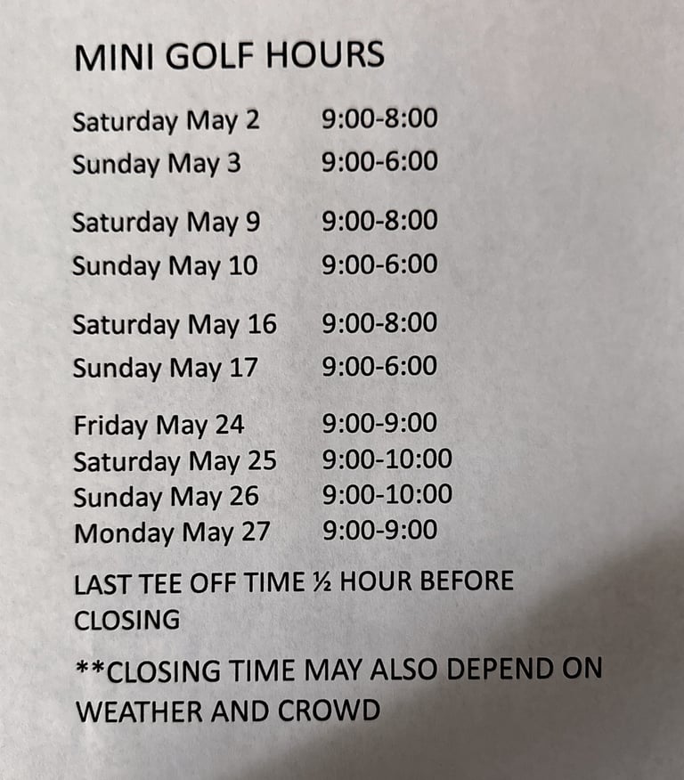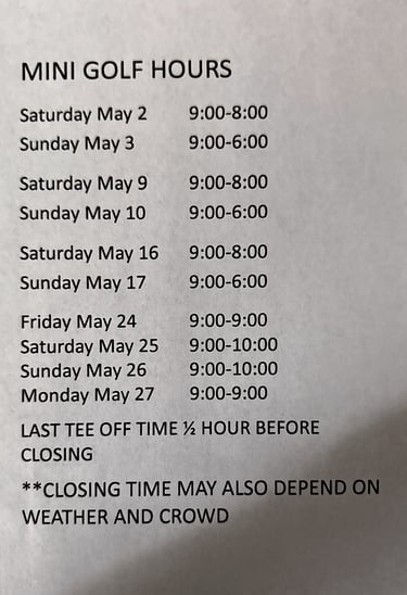 The mini golf is open weekends beginning of May until Memorial weekend then everyday until Labor Day. Also open the weekend after Labor Day. For more information contact us at (440)812-0604, (440)466-7922 or email jkar1991@yahoo.com or allisonsminigolf@yahoo.com
